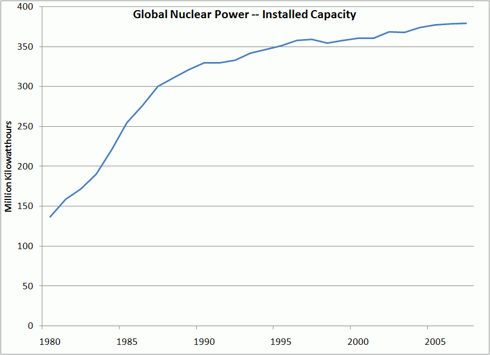 This graph tracks global nuclear power capacity from 1980 to 2007. Note that there’s a big different between installed capacity and electricity generation. Installed capacity measures the total potential power output of all plants operating at full capacity. Generation is the amount of power actually produced; as you might expect, the total amount of power generated will always be less than global capacity.