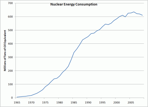 Nuclear power consumption grew at an impressive pace from 1965 to 1990. As nuclear power capacity growth hit a wall in 1990, the rate of growth in nuclear power consumption also slowed but didn’t stop completely.