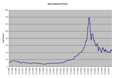 Uranium prices have pulled back sharply since then, hitting a low of $40.50 per pound in April 2010. But prices didn’t come close to their 2001-03 lows.