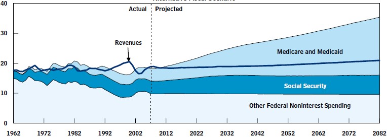 If there is one thing I would love for all Americans to have in mind when evaluating politicians' pronouncements about what we have done or should do with respect to government health spending it is this graph of projected federal revenue and spending as a percent of GDP, from the CBO: